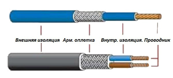 Это электрический провод, резистивный или саморегулирующийся, помещенный в изолирующую оболочку. Резистивный кабель нагревается при подаче тока равномерно по всей длине. Бывает как одножильным, так и двужильным (один или два изолированных проводника соответственно). К одножильному кабелю питание подключается с обоих концов, к двужильному – лишь с одного, поэтому процесс укладки этого кабеля проще. Второй конец двужильного кабеля ограничен муфтой.