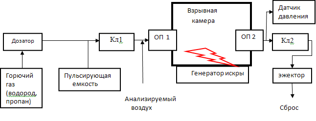 Процесс анализа протекает следующим образом (Рис.2). Часть воздуха, поступающего из помещения на анализ по цепочке «входной огнепреградитель ОП 1– взрывная камера – выходной огнепреградитель ОП 2 – открытый клапан Кл2 - эжектор» транспортируется на сброс.