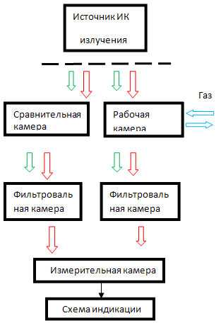 В общем случае схема газоанализатора, работающая на этом принципе изображена слева на схеме. Схема содержит источник инфракрасного излучения, поток которого поступает в камеры двух оптических каналов. Оба канала идентичны в конструктивном исполнении, но отличаются по «внутреннему содержанию». Сравнительная камера (левый канал) заполнена чистым воздухом, а через объем рабочей камеры постоянно продувается контролируемая газовая смесь.