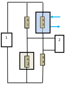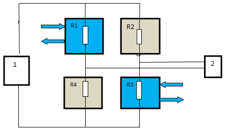 R1 - R4. Резисторы R1и R3 являются рабочими и размещены в каналах, через которые транспортируется анализируемая смесь, а резисторы R2 и R4 – сравнительные и расположены в закрытых каналах, заполненных воздухом.