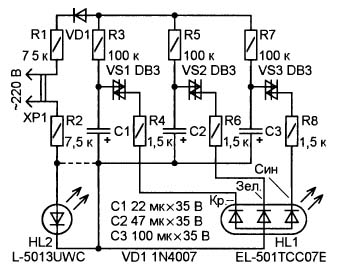 Конденсатор C1 через резистор R3 заряжается от выпрямителя R1, VD1 до напряжения пробоя динистора VS1 (32В). Как только динистор откроется, конденсатор C1 разряжается через красный элемент трехцветного светодиода, резистор R4, и динистор VS1. Далее цикл повторяется.