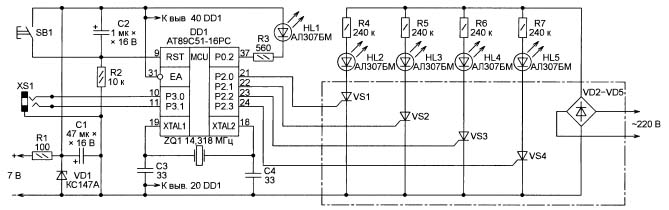 А тут достаточно было на неисправной плате поменять контроллер, написать программу со световыми эффектами и дополнить каким-нибудь пультом управления. Вот этим пультом и стал валявшийся без дела старенький телефон Siemens C60. В качестве управляющего был применен микроконтроллер AT89C51. Что из этого получилось, показано на рисунке 3.
