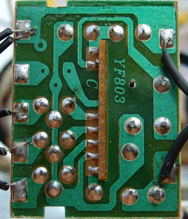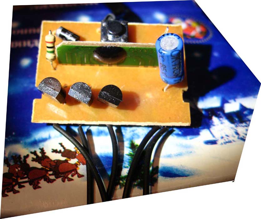 Здесь можно рассмотреть все детали. Микроконтроллер, как всегда, выполнен в виде капли черного компаунда, около него кнопка управления, электролитический конденсатор, единственный диод и три выходных тиристора.