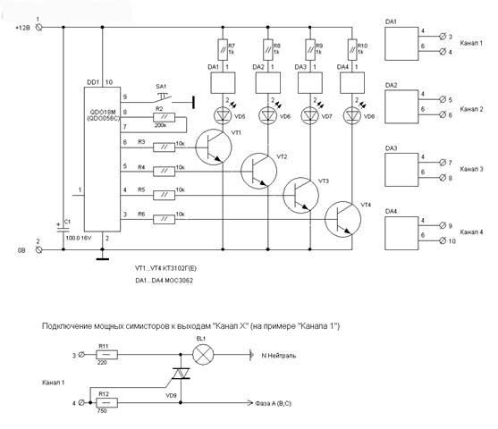 Иногда требуются новогодине гирлянды большой мощности, от нескольких сотен ватт и выше. В этом случае рассмотренную схему можно использовать в качестве «мозгов», достаточно просто дополнить ее мощными симисторными ключами. Как это сделать, показано на рисунке 8.
